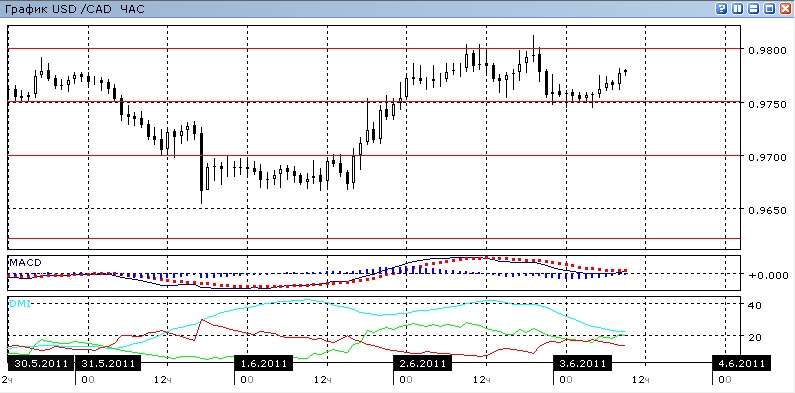 Пара вернулась к прежнему диапазону 0,9760-0,9800. Верхняя граница этого канала по-прежнему устойчива. От нижней пара только что оттолкнулась. Судя по индикаторам на четырехчасовом графике, по крайней мере пара должна вернуться к верхней границе канала: хотя ADX и снижается, но DM+ достаточно превышает DM-, а линия MACD по-прежнему направлена вверх. На часовом графике происходит разворот вверх: гистограмма MACD готовится пересечь нулевой уровень, а линия MACD развернуться вверх.