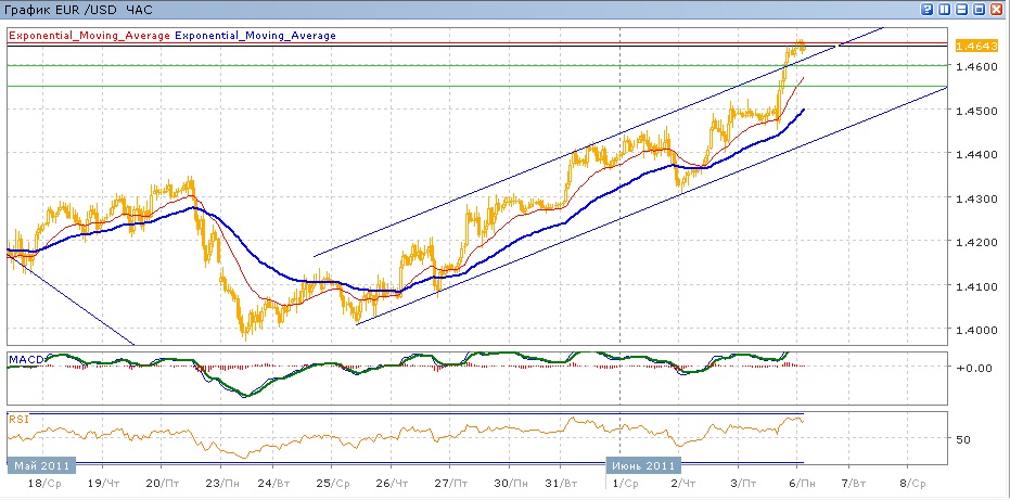 с 23 мая пара растет. Уровень 1.4500 в пятнциу продержался чуть более половины торгового дня и ближе к концу сессии был пройден вверх, в итоге пара завершила прошлую неделю на отметке чуть ниже 1.4650, добравишсь таким образом до уровня месячного максимума. Сейчас пара торгуется на уровне открытия, пытаясь преодолеть 1.4650 вверх. Средние скользящие ЕМА21 и ЕМА55 продолжают свой рост, индикаторы MACD и RSI с четверга находятся надсвоими центральными линиями и сегодня продолжают расти. На сегодня цели вверх — 1.4650, 1.4700. Цели вниз на сегодня — 1.4600, 1.4550