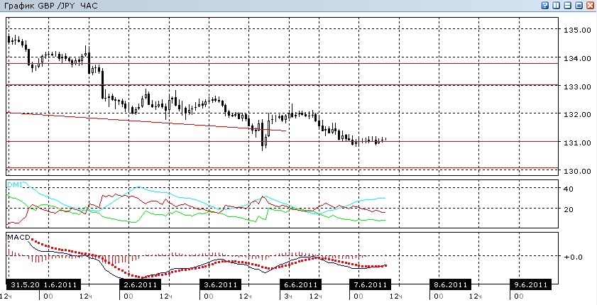 Хотя за последние дни пара снижалась, близость важного уровня поддержки 130,00 в случае задержки с его преодолением может сформировать на дневном графике бычье расхождение минимумов MACD и цены, которое может реализоваться в более существенном отскоке вверх от уровня поддержки. Предпосылки с формированию аналогичного расхождения есть и на четырехчасовом графике, хотя в остальном снижение в этом таймфрейме выглядит довольно уверенным — из-за сильного наклона вниз линии MACD и свидетельствующем о снижении индикаторе ADX: она растёт, и так находясь на высоком уровне, при большой разнице между DM+ и DM-. На часовом графике можно наблюдать остановку, обусловленному близостью важного уровня сопротивления. Гистограмма MACD колеблется около нуля, а линия MACD почти горизонтальна. Формирование последовательности свечей «дожи» дополняет картину остановке на уровне. Вместе с тем, в часовом масштабе индикатор ADX по-прежнему говорит о предпочтительности дальнейшего движения вниз.