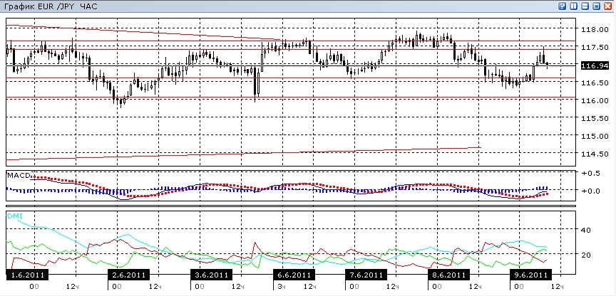 Сохраняют своё действие уровни поддержки и сопротивления 117,65 и 116,61. Пара находится в диапазоне. За время, прошедшее с предыдущего обзора успела протестировать уровень сопротивления, потом уровень поддержки, и сейчас она замедляет рост около уровня сопротивления. Скорее всего, верхняя граница диапазона не будет преодолёна, так как выраженный на часовом графике рост замедляется, а на более крупных таймфреймах уже не наблюдается. Верхние тени последних свечей на часовом графике также свидетельствуют в пользу того, что уровень сопротивления скорее всего устоит.