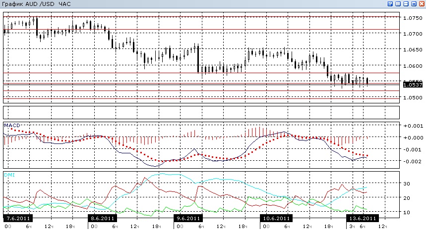 Хотя паническое снижение пары после данных о занятости и было почти отыграно, тенденция взяла свое, и сейчас пара находится на уровне, лежащем ниже чем линия сопротивления 1,0595, которое оказало поддержку после снижения пары на новостях. Хотя сейчас пара торгуется вблизи другой линии сопротивления, картина дневного графика — в пользу продолжения снижения. В пользу этого конфигурация максимумом MACD, гистограммы MACD и цены, отрицательный наклон линии MACD и превышении DM- над DM+ при начавшемся росте ADX. Стоит иметь в виду возможность формирования бычьего расхождения между минимумами гистограммы MACD и цены. На четырехчасовом графике ADX показывает на достаточно сильное снижение, как и линия MACD, однако небольшое бычье расхождение минимумом гистограммы MACD и цены может предзнаменовывать по крайней мере отскок вверх от уровня поддержки в ближайшее время. На часовом графике пара остановилась около уровня 1,0550. Судя по уменьшению отрицательного наклона линии MACD и выходящей в положительную зону гистограмме MACD, мы можем увидеть очередную коррекцию к снижению. Однако общая картина скорее дает основания предполагать продолжение движения вниз.