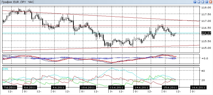 Выход из треугольника, не получившийся 13 июня, уже близок. На дневном график картина неопределенная, с некоторым предпочтением в выходу вниз. На четырехчасовом графике движение вверх, кажется, остановилось еще до достижения верхней границы — линии сопротивления. Гистограмма MACD в этом масштабе начала снижаться, линия MACD переходит к горизонтали, а у индикатора ADX линия DM- пересекла вверх линию DM. Это позволяет предположить, что дальше пара может направиться к линии поддержки, которая располагается около уровня 115,02. На часовом графике снижение уже началось, хотя оно происходит без выраженной энергии: снижение ADX и остановка снижения гистограммы MACD могут быть знаком остановки.