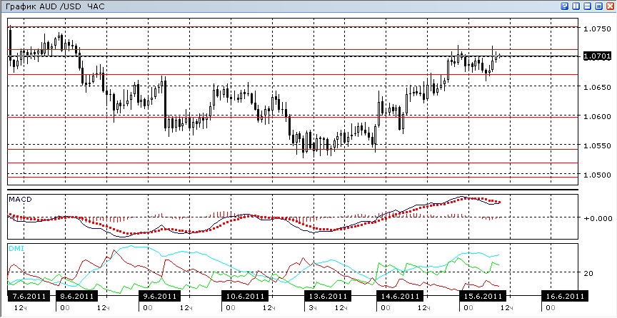 Пара зажата сейчас между несколькими сильными уровнями поддержки в районе 1,0500 и максимумами, для преодоления которых фундаментальные данные кажутся недостаточными. На дневном графике картина неопределенная: индикатор ADX указывает скорее на флэт, линия MACD немного снижается, а уровни гистограммы MACD растут. Не очень далеко сопротивление на уровне 1,0751. На четырехчасовом графике индикаторы направленного движения показывают на рост, но гистограмма MACD расти прекратила, что вместе с появлением свечей дожи может обозначать возможное прекращение роста, что и видно в часовом масштабе. Показания указывающего на рост индикатора ADX вступают в противоречие со снижающимися линией MACD и колебаниями около нуля гистограммы MACD. Здесь уровнем сопротивления выступает 1,0711.