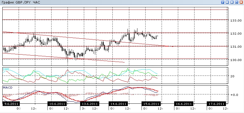 На дневном графике видна реализация образовавшегося ранее бычьего расхождения, однако несильная, так как пока нельзя сказать что тенденция к снижению сменилась. Индикаторы направленного движения в этом масштабе скорее указывают на снижение, но не сильно: разница между DM+ и DM- небольшая, линия MACD почти горизонтальна, а гистограмма MACD недалеко от нуля. На четырехчасовом графике пара остановилась около уровня сопротивления 132,00: на этом уровне гистограмма MACD начала снижение, а линия MACD поворачивает к горизонтали. Таким образом, возможно снижение от этого уровня хотя бы до близлежащего важного уровня 131,00. В часовом масштабе наблюдается противоречие индикаторов друг другу: если ADX продолжает указывать на рост, хотя и замедляющийся, то линия MACD отрицательным наклоном указывает на снижение, а начавшийся рост гистограммы MACD — и на возможное окончание этого снижения.