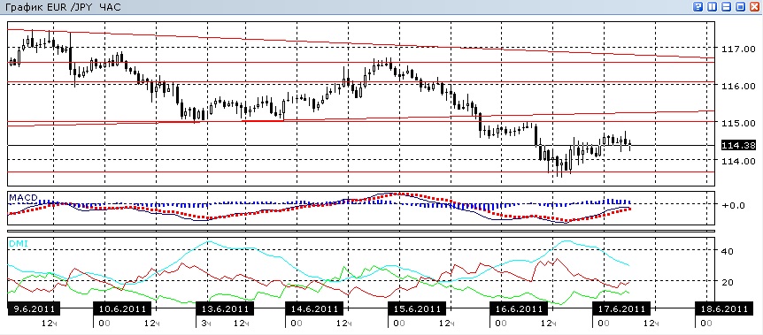 Выход из треугольника, формировавшегося один-два месяца, произошел вниз. Если будет преодолен уровень предыдущего относительного минимума 113,74, то пара может опуститься и ниже, в район 110. На четырёхчасовом графике наблюдается коррекция к снижению предыдущих дней, но это рост, кажется, себя исчерпал. Индикаторы направленного движения на дневном и четырехчасовом графиках показывают в пользу снижения пары, бычьих расхождений на наблюдается. На часовом графике тенденция пока не возобновилась: линия MACD направлена вверх, гистограмма MACD, хотя и замедляясь, растёт. Возможный сценарий — некоторое продолжение роста, до уровня около 115,00-115,40. Тем не менее, предпочтительным кажется направление вниз, с продолжением текущей коррекции или без.
