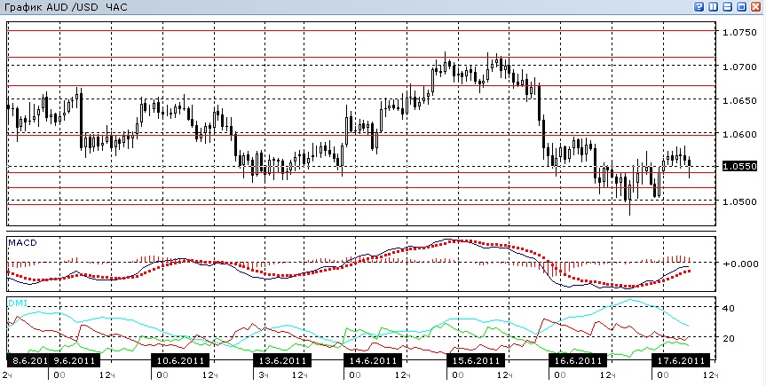 За время очередного локального подъема предыдущий локальный максимум, сформированный 6-7 июня, не был превышен и даже не был протестирован. Снизившись до уровня последнего локального минимума, сходу пара его не преодолела вниз, но этот процесс продолжается. На дневном графике предпочтительным кажется снижение, хотя по-настоящему оно еще не начиналось. В его пользу — снижение гистограммы MACD и отрицательный наклони линии MACD. На часовом четырехчасовом графике выраженного снижения не наблюдается, скорее это постепенное снижение уровня, вокруг которого совершаются примерно одинаковые колебания. На часовом графике наблюдается остановка после недавней коррекции. Показания индикаторов направленного движения скорее в пользу снижения: начала снижение гистограмма MACD, а у индикатора ADX, хотя он и снижается, линия DM- остаётся выше линии DM+. Линия MACD пока направлена вверх, но наклон ее снижается.