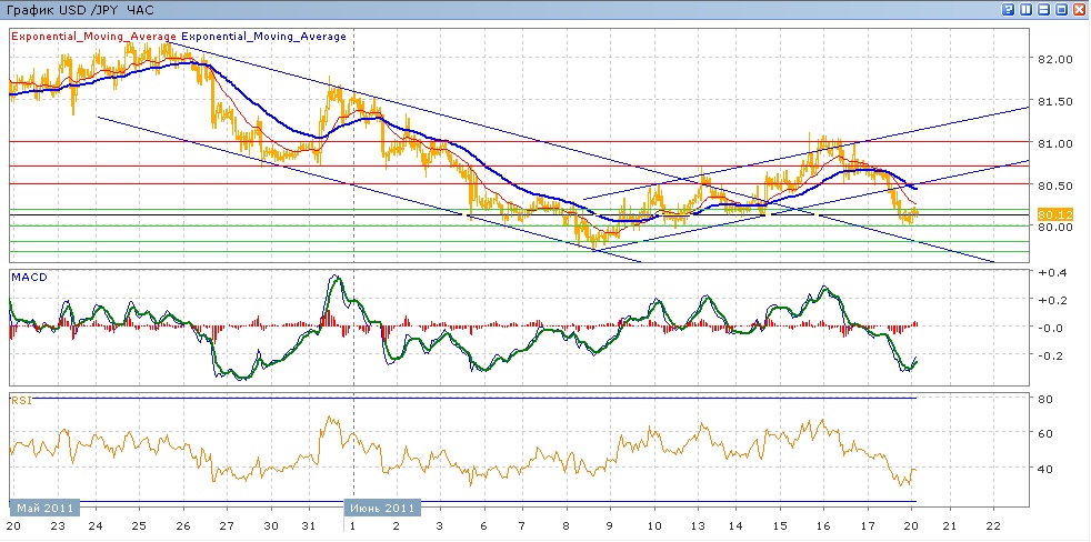 рост пары в конце среды и начале четверга к отметке 81.00 завершился откатом вниз. Пара не сумела преодолеть это сопротивление и к концу пятницы снизилась до 80.20, около которого сейчас пока и торгуется. Средние скользящие ЕМА21 и ЕМА55 в целом снижаются, и в пятницу пересеклись вниз, индикаторы MACD и RSI всера ушли под своим центральные линии и сегодня слабо растут. Цели вверх на сегодня — 80.50, 80.76, 81.00. Цели вниз — 80.00, 80.20, 79.69 (уровень минимума от 8 июня), 79.40.