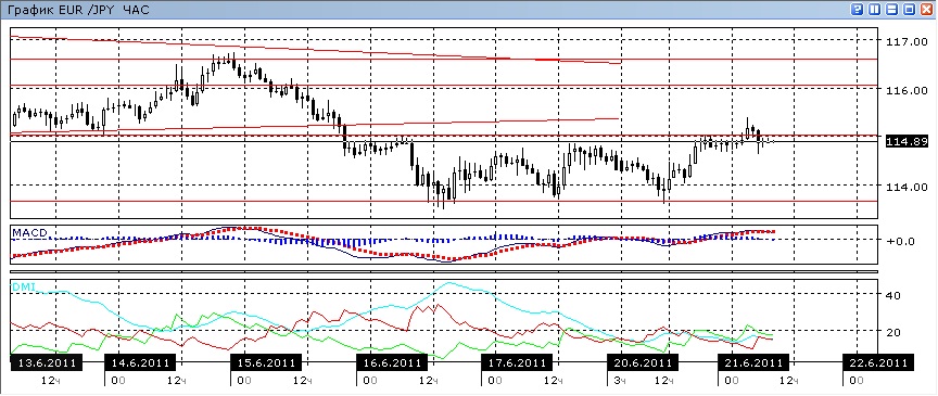 Усиление евро из-за оптимизма, связанного с перспективами долгового кризиса Греции, внесло коррективы в ранее определенную нисходящую тенденцию. Пара оттолкнулась от уровня 113,74 и дошла до уровня сопротивления 115,00, где и находится сейчас. На дневном графике ранее сформировалось небольшое бычье расхождение между минимумами пары и минимумами гистограммы MACD. Вполне возможно оно будет реализовываться и приведет к дальнейшему росту пары. Однако в ближней перспективе видится, скорее, снижение по причине образования выраженной вершины. На часовом графике рост пары останавливается: это видно по началу снижения гистограммы MACD.