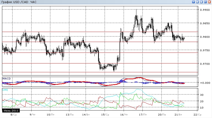 Скорее пара стремится снижаться. Помимо почти удавшегося формирования полукруглой вершины, обращает на себя внимание то, что периоды спада были намного больше периодов роста. Индикаторы направленного движения также на стороне этого мнения: гистограмма MACD на четырехчасовом графике развернулась вниз, а линия DM- выше DM+ при растущем ADX. На данный момент пара остановилась перед уровнем поддержки 0,9780. Судя по слабости указывающих на снижение индикаторов, вероятен отскок.