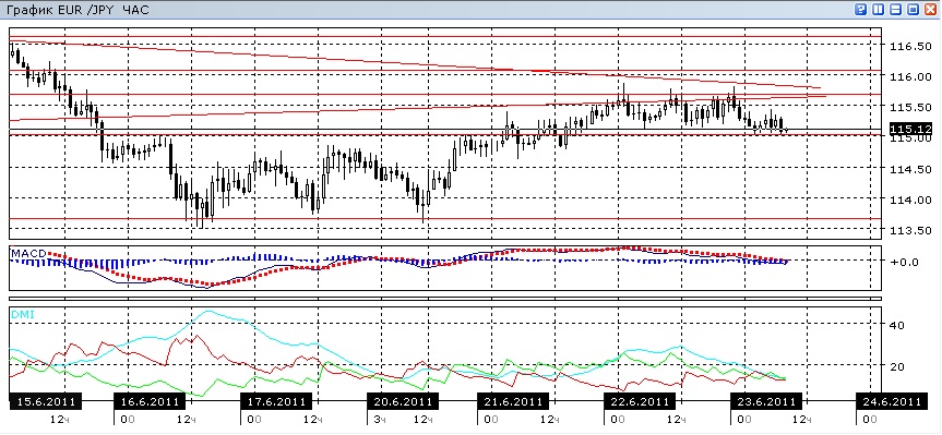 После того, как бычье расхождение реализовалось в небольшом росте пары, наступил период консолидации. Уровнем поддержки выступает 115,00, а уровнем сопротивления, которое не было преодолено несколько раз — 115,70. В дневном масштабе пара не выходила выше нисходящего тренда. По индикаторам направленного движения слабое предпочтение можно отдать снижению. Сами же их значения гистограммы и линии MACD, а также ADX на часовом, четырехчасовом и дневном графике скорее указывают на флэт. Тем не менее, направление вниз кажется несколько предпочтительным из-за нескольких безуспешных попыток продолжить рост после изначального движения 21 июня, а также близости сохраняющейся линии нисходящего тренда и конфигурации последних относительных максимумов и минимумов.