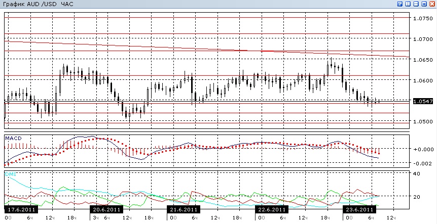 В дневном масштабе пара остаётся в треугольнике, находясь сейчас у его нижней границы, образованной зоной поддержки. О слабом движении вниз говорят направленная немного вниз линия MACD и небольшое, но стабильное превышение DM- над DM+. На четырехчасовом графике индикаторы направленного движения характерны для флэта. На часовом графике изменения в картине произошли после реакции рынка на заявления ФРС. Теперь в часовом масштабе индикаторы показывают снижение, в частности DM+ ниже DM- при растущем ADX, направлена вниз линия MACD. Однако начавшийся рост гистограммы MACD и устойчивость уровня поддержки 1,0540 позволяют предполагать возможность отскока.