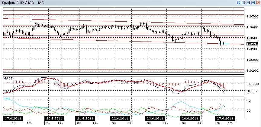 Снижение пары за последние пару дней на дневном графике можно рассматривать и как состоявшийся пробой линии поддержки на уровне 1,0494, и как пробой треугольника, и как пробой нисходящего канала вниз. По индикаторам направленного движения оно наблюдается: ADX начал расти, а DM- увеличивает отрыв от DM+. Линия MACD развернулась ниже. Следующий уровень поддержки находится уже в районе 1,0200. В четырехчасовом масштабе показания индикаторов направленного движения близкие. В часовом масштабе снижению пока ничего не противоречит. Тем не менее, нижняя граница краткосрочного нисходящего канала может выступить уровнем поддержки для пары: на данный момент она находится около 1,0440.
