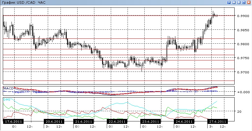 Техническая картина, возможно, изменилась. На дневном графике, можно наблюдать успешное преодоление уровня сопротивления 0,9817, тестирование которого в мае-июне не приводило к прорыву. Последовательность относительных минимумов и максимумов тоже характерна для роста: их уровень постепенно увеличивается. Индикаторы направленного движения также в пользу роста: ADX начал расти, при увеличении разрыва между DM+ и DM-. Линия MACD развернулась вверх. На четырехчасовом графике картина аналогичная, и только на часовом графике наблюдается замедление, которое может вылиться в некоторый откат. Сейчас пара находится около уровня 0,9900 — 16 июня этот уровень как раз выступил уровнем максимума, от которого началось дальнейшее снижение, так что откат от этого уровня вполне возможен. Тем не менее, предпочтительным направлением видится направление вверх.