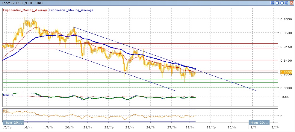 Начавшееся 16 июня снижение пары продолжается. При этом с 22 июня пара получает поддержку на уровне 0.8330-0.8340 (уровень минимумов 6 и 7 июня). Таким образом мы имеем нисходящий треугольник, который, видимо, будет преодолен вниз пробитием этой поддержки. Сегодняшние торги пара пока что проводит с небольшим снижением, средние скользящие ЕМА21 и ЕМА55 направлены вниз, индикаторы MACD и RSI с четверга находятся под своими центральными линиями. На сегодня целями вверх станет 0.8360, 0.8400, 0.8440. Движение вниз направлено на 0.8330, 0.8300