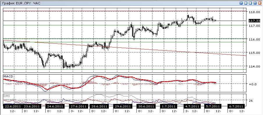 Пока не видно стремления пары преодолеть уровень предыдущего локального максимума. За несколько дней пары хотя и выросла, но этот рост замедлялся. Тем не менее, в дневном масштабе рост пары продолжается, линия MACD направлена вверх, гистограмма MACD не снижается, а ADX подтверждает медленный рост. Уровень предыдущего максимума — 118,00, представляется важным уровнем сопротивления, тем более что перед ним пара замедляется. На четырехчасовом графике ADX продолжает показывать, что пара растёт, но гистограмма MACD уже в отрицательной области, а линия MACD направлена вниз. Это противоречие показаний индикаторов направленного движения предупреждает о возможности отката. На часовом графике картина неопределенная, в этом масштабе пара тяготеет к уровню 117,40. В краткосрочном плане, скорее, предпочтительно снижение, хотя повышающийся тренд может и возобновиться.