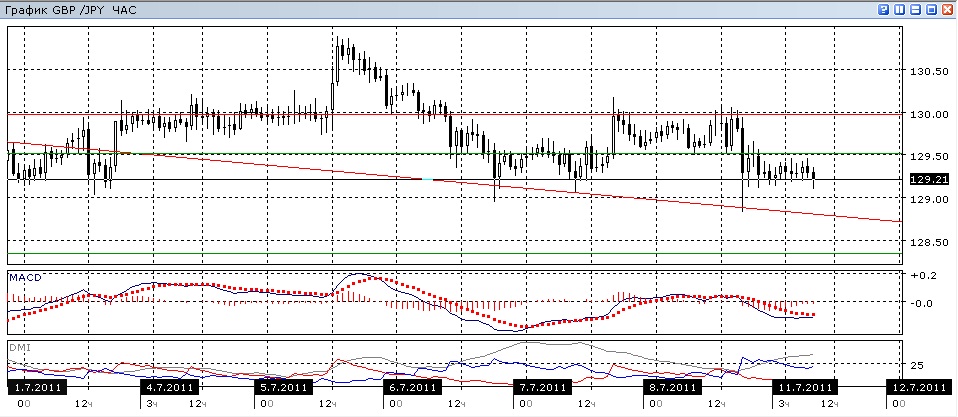 На четырехчасовом графике пара тоже продолжает снижение, хотя оно и медленное. Гистограмма MACD образовала небольшое бычье расхождение минимумов в минимумами цены, возможно оно и реализуется в росте до уровня сопротивления 130,00. Линия MACD показывает на снижение, как и ADX.