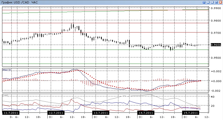 В дневном масштабе пара скорее снижается. Линия MACD направлена вниз, однако то что уровень поддержки 0,9585 не преодолялся, выразилось в начале роста гистограммы MACD. ADX продолжает снижаться, что при близких значениях DM+ и DM-говорит о замедлении движения.