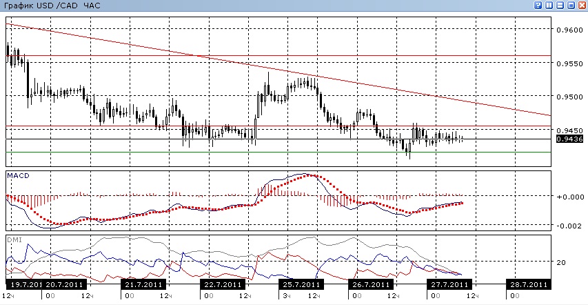 На четырехчасовом графике пара движение вниз замедлилось, по MACD оно уже не наблюдается. На часовом графике пара колеблется около уровня 0,9430, а показания индикаторов направленного движения характерны для флэта.