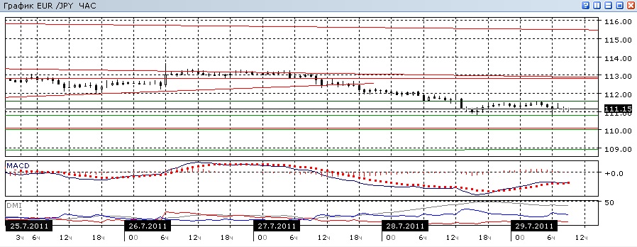 На часовом графике, однако, проявляется действие уровня поддержки 110,80, который пара не преодолела с первого раза. Линия MACD в этом масштабе начала рост, однако гистограмма MACD снижается, на это же показывает и ADX.