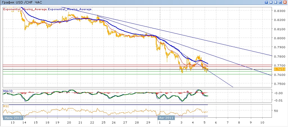 Франк продолжает свое укрепление, показывая новые максимумы. Пока что снижение на этйо неделе остановило пару на уровне 0.7607. последовавшая череда восходящих и нисходящих движений сегодня привела пару почти к минимуму среды и возможно пара и завершит на этом свое недельное движение. Сегодняшние торги проходят достаточно бодро — после тестирования вверх отметки 0.7700 пара откатилась к 0.7614 и сейчас тргуется в районе 0.7650.Средние скользящие ЕМА21 и ЕМА55 уверенно снижаются, индикаторы MACD и RSI, после вчерашнего всплеска, сегодня снова ушли под свои центральные линии. На сегодня целями вверх станет 0.7680, 0.7700. Движение вниз направлено на 0.7630, 0.7600