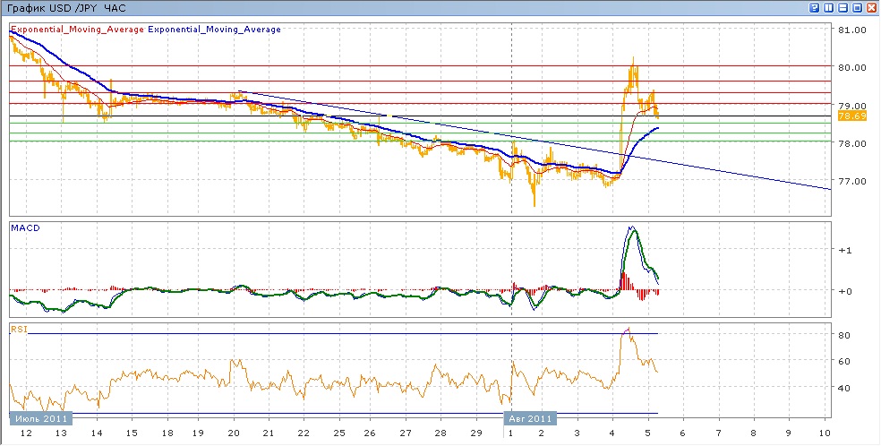 медленное и уверенное усиление йены, которая показала максимум на отметке 76.27 в итоге было нарушено интервенцией правительства Японии. Результатом стало ослабление йены до кровня 80.00 с последующим закрытием вчера пары на отметке 79.00. сегодняшние торги проходят со снижением пары псоле ее небольшого роста. Cредние скользящие ЕМА21 и ЕМА55, отражая интервенцию, резко пересеклись вверх, но начинают показывать признаки замедления. Индикаторы MACD и RSI, также отразив вчерашнее движение, сегодня продолжаю снижаться к своим центральным линиям. Цели вверх на сегодня — 79.00, 79.30, 79.60 80.00. Цели вниз — 78.50, 78.25, 78.00.