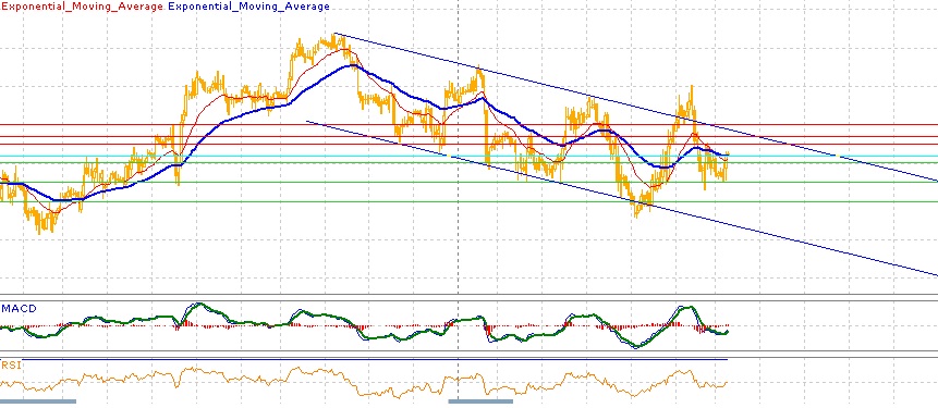 В целом пара на часовом графике продолжает снижатсься, двигаясь в нисходящем канале. Вчерашняя попытка выйти из него вверх не удалась, пара сноваоткатилась в канала, получив поддержку его средней линии. Средние скользящие ЕМА21 и ЕМА55 достаточно уверено снижаются, индикаторы MACD и RSI вчера ушли под свои центральные линии и сегодняподают признаки слабого роста.. На сегодня цели вверх — 1.4220, 1.4250, 1.4270, 1.4300. Цели вниз на сегодня — 1.4200, 1.4150,, 1.4000