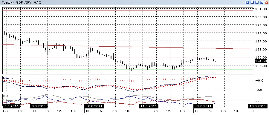 На часовом графике роста пары от уровня 123,40, кажется, уже исчерпал себя и готовится разворот: в пользу этого варианта снижение гистограммы MACD, переход к горизонтали линии MACD и сближение DM+ с DM-.