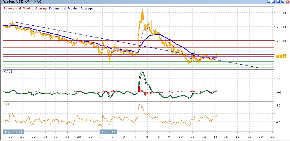 медленное и уверенное усиление йены продлжается, несмотря на проведенную интервенцию. Кратковременное ослабление йены завершилось, пара торговалась со среды в районе 76.50-77.00, в четверг показав почти минимум 1 августа, добравшись до 76.30. сегодяняшние торги проходят со слабым снижением от 77.00, средние скользящие ЕМА21 и ЕМА55 снижаются, но замедляются. Индикаторы MACD и RSI с прошлого четверга ходят вверх-вниз относительно своих центральных линий и сегодня снова пересекли их вверх. Цели вверх на сегодня — 77.00, 77.50, 78.00. Цели вниз — 76.85, 76.50, 76.27 (минимум от 1 августа)