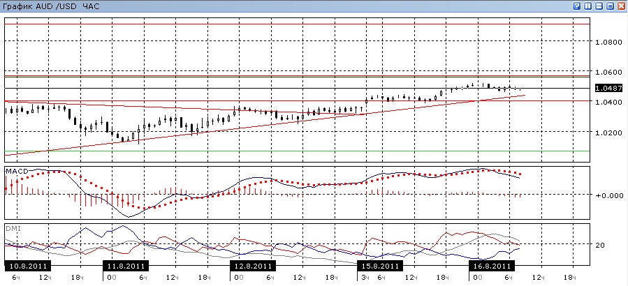 На часовом графике рост тоже кажется предпочтительным, так как максимумы и минимумы пары последовательно повышаются, но предпосылки с окончанию этой последовательности уже видны: это снижение линии MACD, сближение DM+ c DM- при снижении ADX