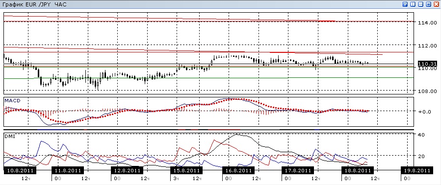 На дневном графике приблизительно одинаковый уровень, на котором пара находится, хотя и с сильными колебаниями, больше двух недель приводит к тому, что индикаторы направленного движения характерны для флэта: ADX снижается, DM+ и DM- почти равны. Линия MACD почти горизонтальна, а гистограмма MACD близка к нулю. В этом масштабе кажется предпочтительным снижение, однако для этого необходимо преодоление восходящего тренда.