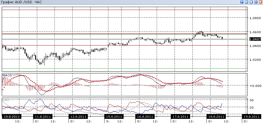 В четырехчасовом масштабе пара скорее перешла к флэту: линии DM- и DM+ сблизились, линия MACD почти горизонтальна, а гистограмма MACD близка к нулю. Медвежье расхождение максимумов гистограммы MACD и цены позволяет предположить возможность, по крайней мере, приближения к уровню поддержки 1,0400.