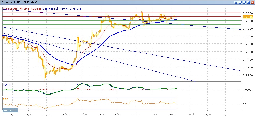 пара пока что приостановила свой рост, начатый 9 августа. Росту пары мешает сопротивление на 0.8000, которое с 15 августа не позволяет паре двинуться выше. Сегодняшние торги проходят малоактвно на уровне открытия. Средние скользящие ЕМА21 и ЕМА55 начинают замедлять свой рост, индикаторы MACD и RSI снизились к своим центральным линиям и сегодня лвигаются почти по ним. На сегодня целями вверх станет 0.7950, 0.8000. Движение вниз направлено на 0.7900, 0.7850, 0.7800