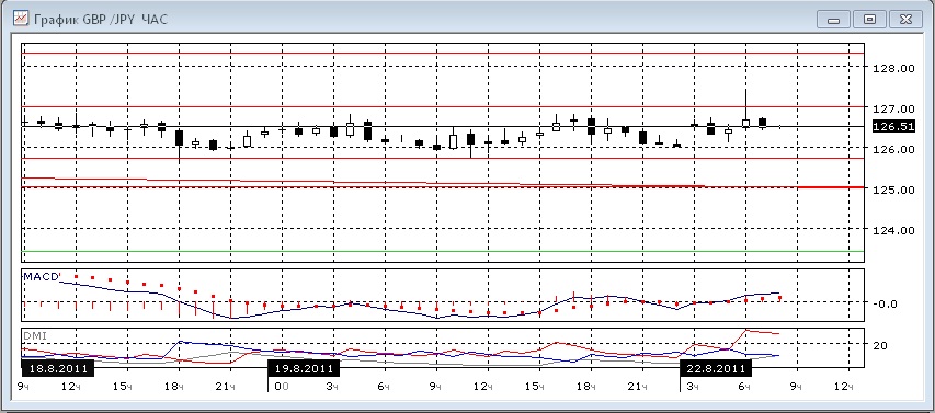На дневном графике, судя по индикаторам направленного движения, роста продолжается, хотя и слабый: DM+ почти равен DM-. Последние свечи особенно свеча с верхней тенью создают возможность формирования вершины, отчего можно ожидать или снижения к линии треда, чтобы он сработал вместе с линией поддержки, на уровне около 125,00. Или снизиться до уровня 123,40.