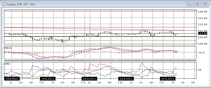 В четырехчасовом масштабе тенденций не появилось, а в часовом масштабе есть признаки начала движения вниз: снижается гистограмма MACD, отрицательный наклон получает линия MACD, ADX начал расти при пересечении DM- DM+ вверх. Однако вполне возможно что это снижение ограничится ближайшим уровнем поддержки.