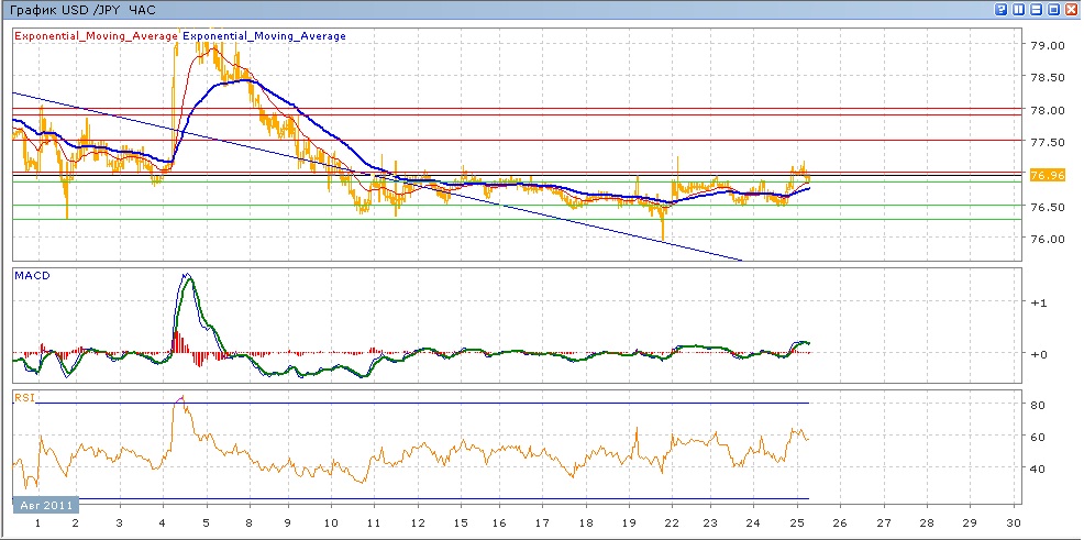 вот уже почти 2 недели, как пара торгуется в пределах достаточно узкого коридора 76.50-77.00.на прошлой неделе пара предприняла попытку снижения, показав минимум ниже 76.00, но затем снова вернулась в коридор, вкотором и движется с начала этой недели. сегодняшние торги проходят на уровне открытия, пара попыталась оторваться вверх от 77.00, но безуспешно. средние скользящие ЕМА21 и ЕМА55 показывают боковое движение и пока что пересеклись вверх. Индикаторы MACD и RSI вчера в очередной раз вышли вверх над своими центральными линиями и сегодня очень слабо снижаются. Цели вверх на сегодня — 77.00, 77.50, 78.00. Цели вниз — 76.85, 76.50, 76.27 (минимум от 1 августа)