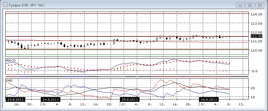 В часовом масштабе имеет место флэт, так как индикаторы направленного движения противоречат друг другу, а пара находится в достаточно узком диапазоне.