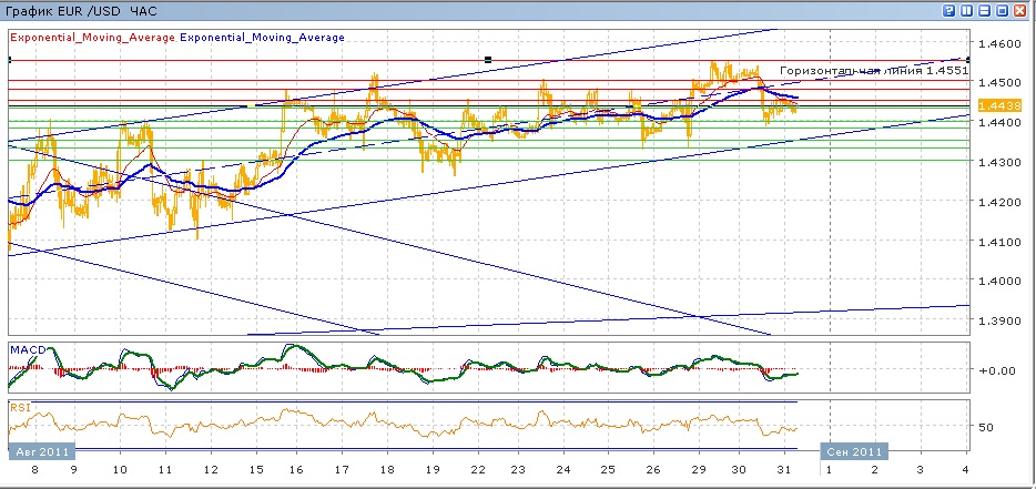 в целом пара продолжает двигаться с 5 августа в восходящем канале. Уровень 1.4500 по-прежнему остается непреодолимым для пары. Конец прошлой недели и начало этой пара пыталась закрепиться выше 1.4500, но вчера упала до 1.4400 с последующей коррекцией 1.4450. с начала сегодняшних торгов пара торгуется с очень слабым снижением. Средние скользящие ЕМА21 и ЕМА55 в целом растут, но пока что пересеклись вниз, индикаторы MACD и RSI вчера ушли под своим центральные линии и сегодня показывают слабый рост. На сегодня цели вверх — 1.4450, 1.4480, 1.4500. Цели вниз на сегодня — 1.4430, 1.4400, 1.4350, 1.4330, 1.4300