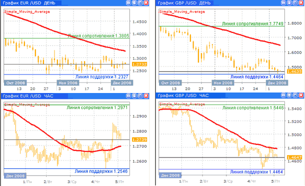 Прошедшая торговая неделя не принесла каких либо серьезных изменений в курсах доллара США. Экономическая ситуация в Соединенных Штатах все более и более складывается в негативную картину. Индекс деловой активности в производственном секторе (ISM) продемонстрировал самое большое снижение в месяц за последние 26 лет. Изменение рабочих мест в частном секторе за ноябрь составило вопреки прогнозам -250 тыс., что свидетельствует о нарастающей волне увольнений. Судя по всему валютные трейдеры продолжают игнорировать фундаментальные данные, опираясь для принятия решений в основном на изменчивую динамику фондовых рынков. На наш взгляд в связи с этим курсы доллара сейчас находятся в шатком равновесии. На поведение американской валюты влияют также и низкие цены на нефть. Власти США продолжают изыскивать антикризисные меры. Так, в четверг глава ФРС Бен Бернанке заявил, что необходимо принимать более решительные меры для предотвращения потерь жилья, вплоть до выкупа заложенных домов государством.