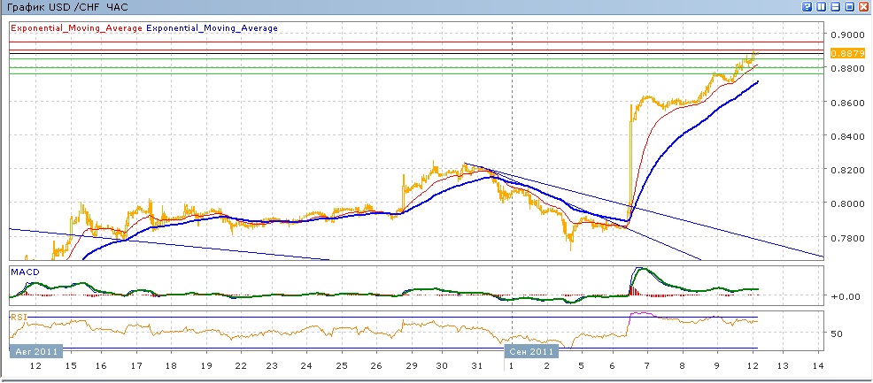 Решение Нац. Банка Швейцарии в прошлый вторник о привязке курса франка к евро привело к его резкому снижению до уровней конца мая, это движение продолжалось всю прошлую неделю, врезультате чего пара закрылась выше 0.8800. Средние скользящие ЕМА21 и ЕМА55 резко пошли вверх, индикаторы MACD и RSI после резкого роста в прошлый вторник затем началаи снижаться и сейчас находятся выше своих центральных линий и, в отличие от пары, не показывают роста. Сегодняшние торги идут с небольшим ростом. На сегодня целями вверх станет 0.8900, 0.8950. Движение вниз направлено на 0.8850, 0.8800, 0.8760