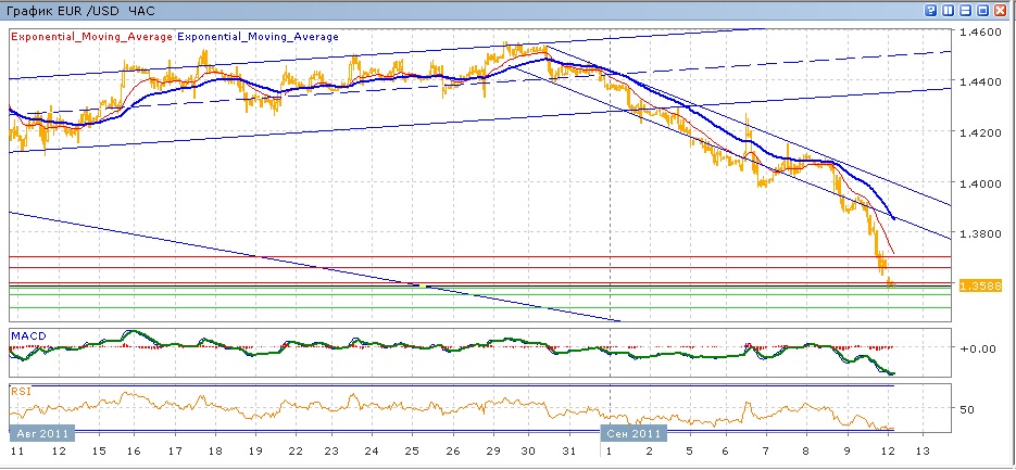 продолжавшееся относительно равномерно снижение пары резко усилилось в пятницу, когда пара потеряла почти 300 пунктов и добраась до уровней 22 февраля, показав почти 7-месячный минимум. Средние скользящие ЕМА21 и ЕМА55 еще более ускорили свое снижение, индикаторы MACD и RSI уже десятый день как под своими центральными линиями и сегодня показывают некотрое замедление снижения. Торги пока что проходят слабо, хотя и начались с почти 50-пунктого гэпа вниз. На сегодня цели вверх — 1.3600, 1.3660, 1.3700. Цели вниз на сегодня — 1.3580, 1.3550, 1.3500