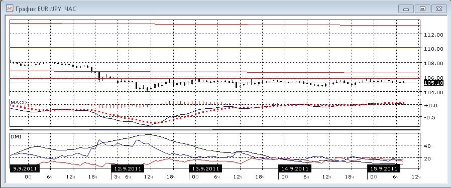 На четырехчасовом графике явной тенденции нет - судя по линии MACD и гистограмме MACD пара растёт, а по ADX снижается. Здесь уровень 105,80 выступает уровнем сопротивления, который пока не преодолевается.
