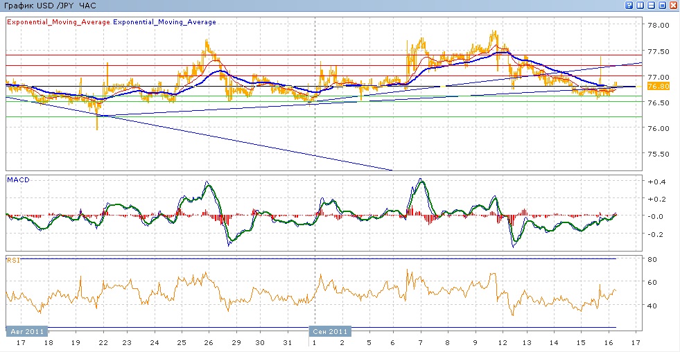 так и не преодолев уровень 77.70-77.80, пара нчалач с прошлой пятницы снижаться. К середине недели пара преодолела вниз уровень 77.00, добравшись вчера до поддержки на 76.60. сегодняшние трги проходят с небольшим ростом, пара пытается преодолеть сопротивление нисходящей ЕМА55 и закрепиться над ней. ЕМА21 и ЕМА55 всю эту неделю снижались, но сейчас подают признаки замедления. Индикаторы MACD и RSI всю эту неделю находились под своими центральными линиями и сегодня растут, пытаясь преодолеть центральные линии. Цели вверх на сегодня — 77.00, 77.20, 77.40. Цели вниз — 77.60-77.50, 76.20