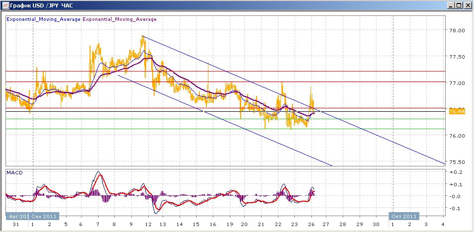 Начавшееся на позапрошлой неделе снижение с 21 сентября не способно преодолеть поддержку пары на уровне 76.20-76.10. попытка покупателей вырваться вверх из нисходящего канала дала кратковременный эффект, и в ходе сегодняшних торгов пара снова вернулась в нисходящий канал. ЕМА21 и ЕМА55 в целом снижаются, сейчас пересеклись вверх, но роста не показывают. Индикаторы MACD и RSI сегодня вышли вверх над своими центральными линиями и растут. Цели вверх на сегодня — 76.50, 77.00, 77.20, 77.40. Цели вниз — 76.30, 76.10