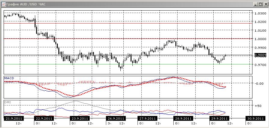 На дневном графике тенденцией продолжает оставаться снижение, однако о его продолжении можно будет говорить, если пара преодолеет уровень поддержки 0,9700. Рост гистограммы MACD в данном масштабе не привел к итоговому росту пары, а сильный наклон вниз линии MACD и большое превышение DM- над DM+ показывает, что нисходящая тенденция сильна.