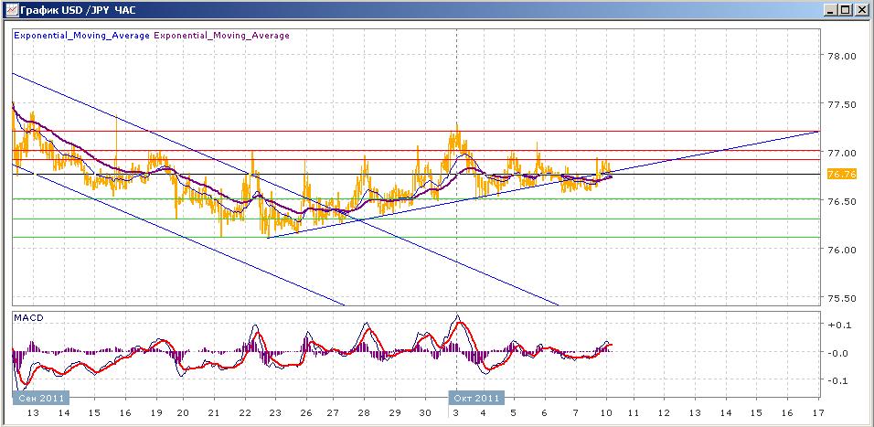 собственно, ситуация с парой продолжает оставаться без изменений — она не первую неделю движется в коридоре 76.00-78.00. всю прошлую неделю пара двигалась в еще более узком диапазоне 76.50-77.00. Сегодняшние торги проходят с небольшим снижением пары. Средние скользящие ЕМА21 и ЕМА55 пока что не отражают выраженного движения в какую-либо сторону. Индикаторы MACD и RSI продолжают колебаться вокруг своих центральных линий. Цели вверх на сегодня — 76.90- 77.00, 77.20, 77.40. Цели вниз — 76.50, 76.30, 76.10