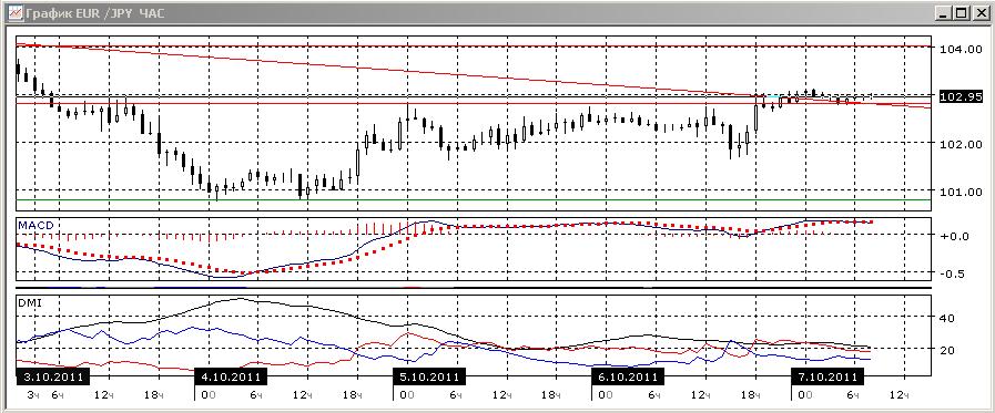На часовом графике пара ближайшая поддержка — 104,40. Начало снижения пары по гистограмме и линии MACD противоречат росту по ADX, хотя по этому индикатору интенсивность роста постепенно снижается.