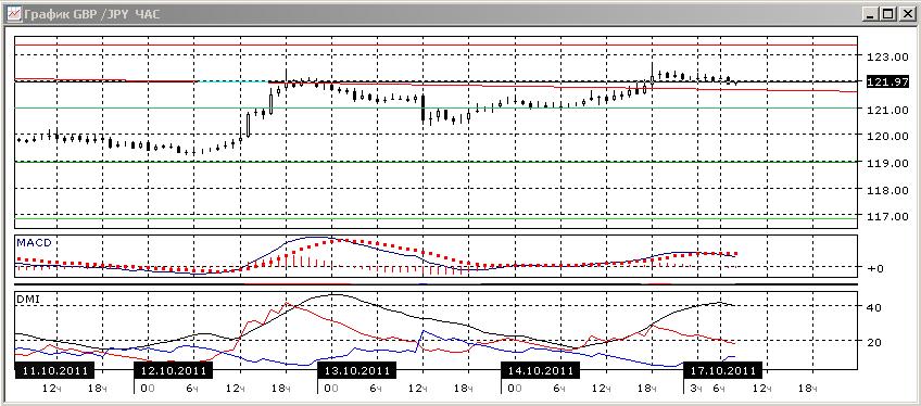 На четырехчасовом графике видно, что в зоне около 122,00 рост пары встречает противодействие. Как и в паре иены с евро, наблюдается формирование медвежьего расхождения максимумов пары и гистограммы MACD. С случае реализации целью видится уровень поддержки 121,00.