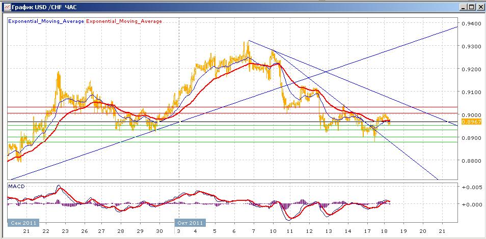 Снижение пары, начатое 6 октября от уровня 0.9300, продолжается. Прошедшую неделю пара завершила очень близко от уровня 0.8900, а вчера попыталась его преодолеть вниз, но безуспешно. Последовавший рост к отметке 0.9000 не смог ее преодолеть и пара с начала сегодняшних торгов снижается. Средние скользящие ЕМА21 и ЕМА55 в целом снижаются, индикаторы MACD и RSI всю прошлую неделю пытавшиеся выйти выше своих центральных линий, сегодня вышли вверх над ними, но подают признаки очередного снижения. На сегодня целями вверх станет 0.9000, 0.9030 . Движение вниз направлено на 0.8950, 0.8930, 0.8900.