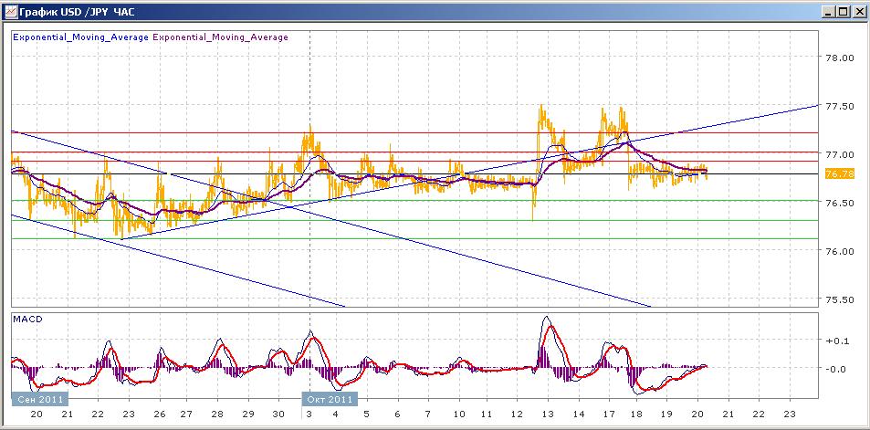 ситуация с парой продолжает оставаться без изменений — она не первую неделю движется в коридоре 76.00-78.00, показывая с 22 сентября слабое восходящее движение в рамках коридора. В понедельник пара снова попыталась вырасти, но в очередной раз уперлась в сопротивление на 77.40, которое с прошлой неделе не дает паре расти. После чего последовал откат вниз до 76.70. со вторника пара движется в очень узком коридоре в границах 76.60-76.90. сегодняшние торги проходят с небольшим снижением пары. Средние скользящие ЕМА21 и ЕМА55 пересеклись вниз, индикаторы MACD и RSI с понедельника находятся под своими центральными линиями и сегодня показывают показывают рост. Цели вверх на сегодня — 76.90- 77.00, 77.20, 77.40. Цели вниз — 76.50, 76.30, 76.10