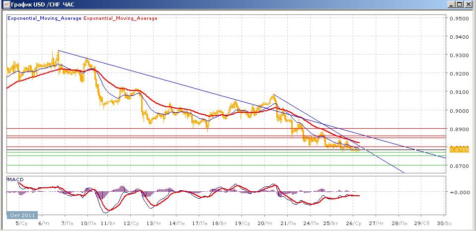 снижение пары продолжается. Понедельник прошел большей частью в попытке пары преодолеть вниз уровень 0.8800, что ей и удалось к концу торгов вторника. Сегодняшние торги проходят на уровне открытия с небольшой вероятностью продолжения снижения. Средние скользящие ЕМА21 и ЕМА55 пересеклись вниз и уверенно снижаются, индикаторы MACD и RSI с прошлого четверга находятся ниже своих центральных линий, но с понедельника постепенно растут и сегодня пока не движутся в какую-либо сторону. На сегодня целями вверх станет 0.8800, 0.8850-0.8860. Движение вниз направлено на 0.8770. 0.8750, 0.8700